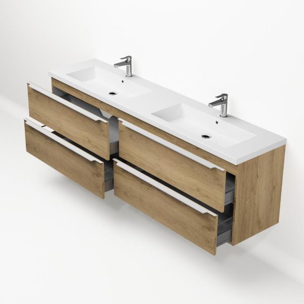 Badkamermeubel met inleggreep naar keuze, in de kleur eiken warm in 200 cm breed. De wastafel is vervaardig in polystone en heeft de kleur wit. Dit badkamermeubel met deze wastafel is leverbaar tussen de 60 cm t/m 200 cm