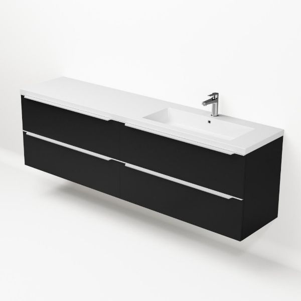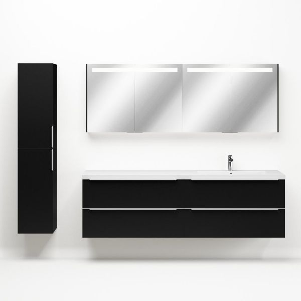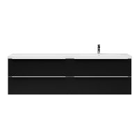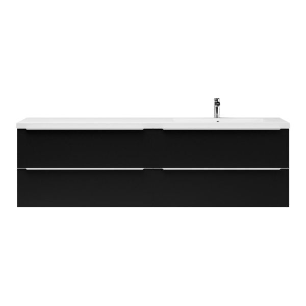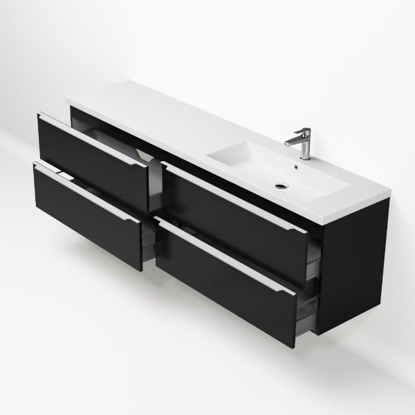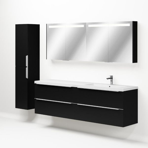 Badkamermeubel met inleggreep naar keuze, in de kleur zwart mat in 200 cm breed. De wastafel is vervaardig in polystone en heeft de kleur wit. Dit badkamermeubel met deze wastafel is leverbaar tussen de 60 cm t/m 200 cm