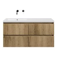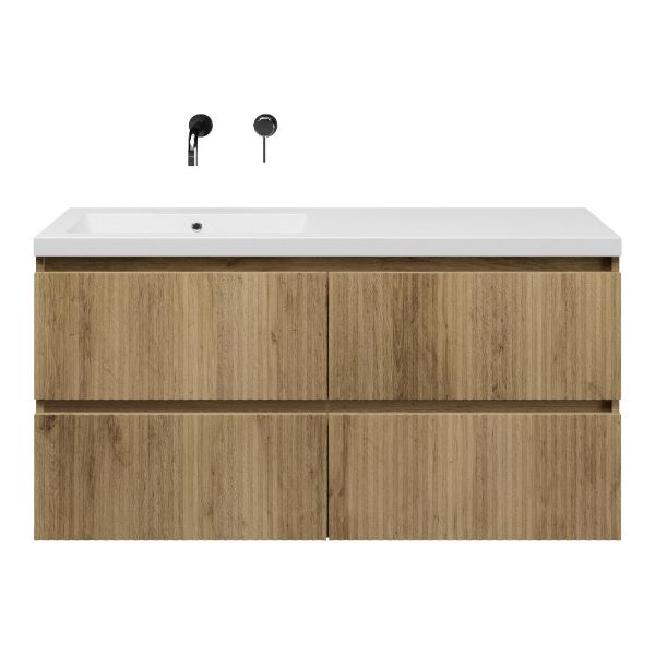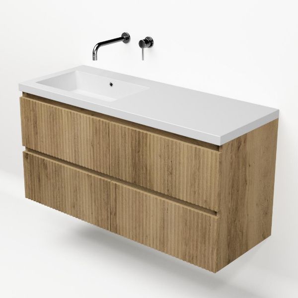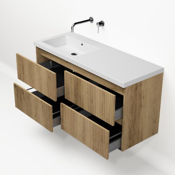 Bellanti Silvan/Esta-Q badmeubel 120x46 4 softclose laden met ribbel - latjes structuur warm eiken greeploos quartz wastafel mat wit links zonder kraangaten
