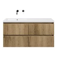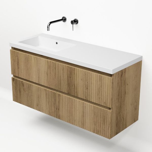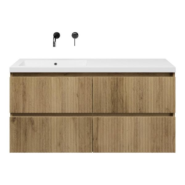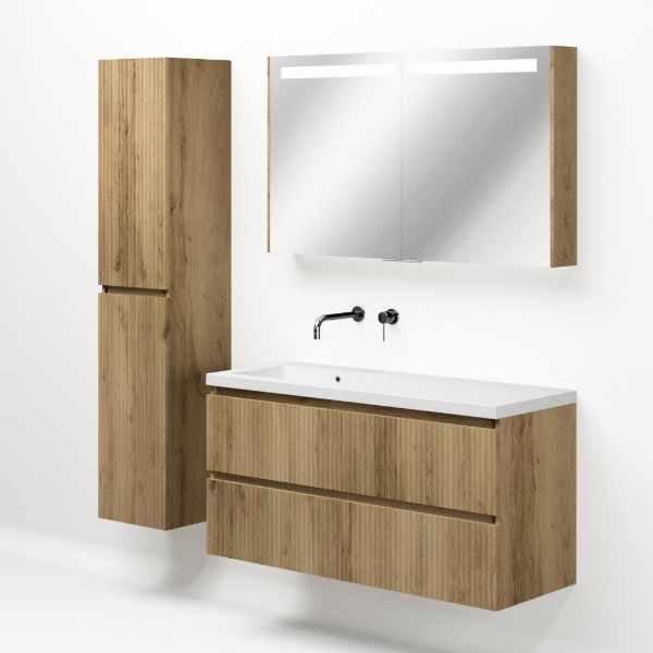 Bellanti Silvan/Esta badmeubel 120x46 4 softclose laden met ribbel - latjes structuur warm eiken greeploos polystone wastafel wit zonder kraangaten