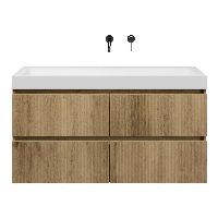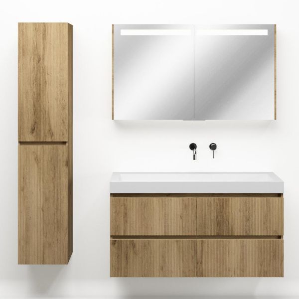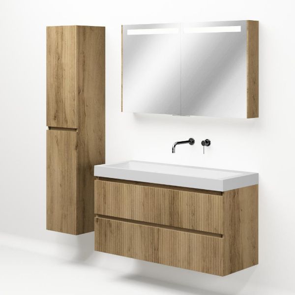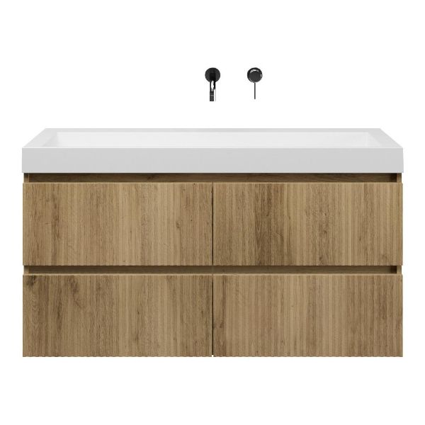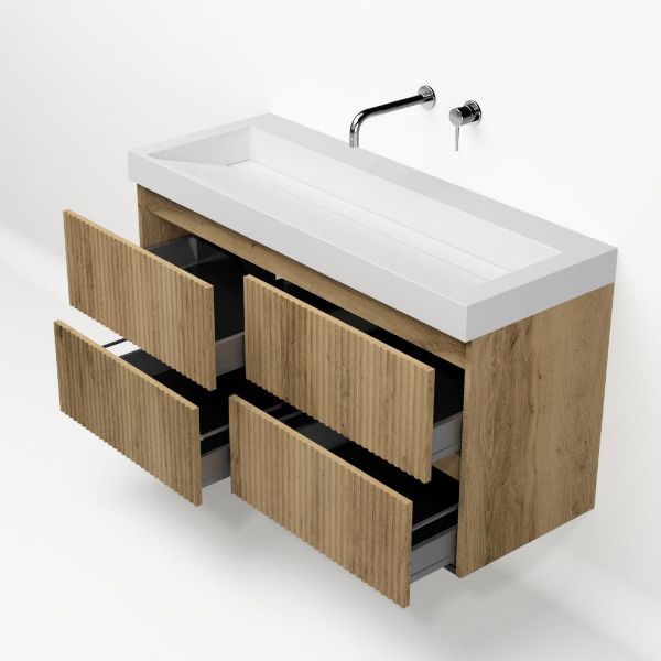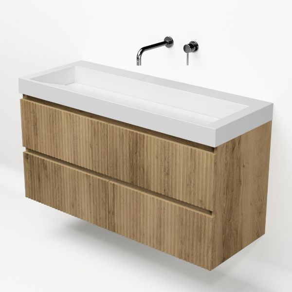 | | Bellanti Silvan/Renzo-q badmeubel 120x46 4 softclose laden met ribbel - latjes structuur warm eiken greeploos quartz wastafel mat wit zonder kraangaten |