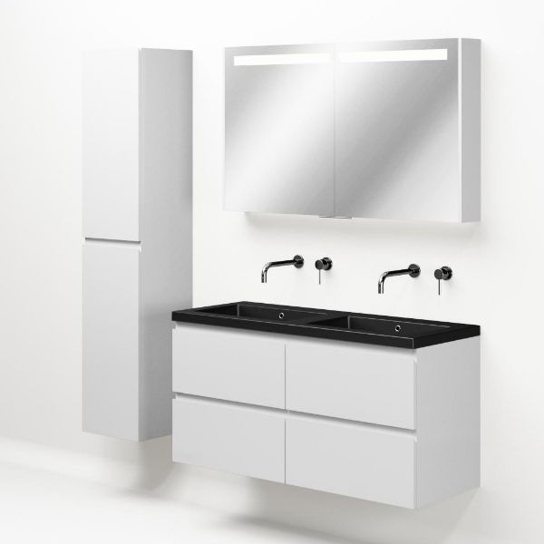 Greeploos badkamermeubel in de kleur wit hoogglans is 120 cm breed. De wastafel is vervaardig in polystone en heeft de kleur zwart mat. Dit badkamermeubel met deze wastafel is leverbaar tussen de 60 cm t/m 200 cm