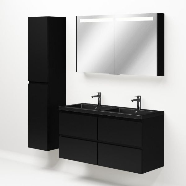 Greeploos badkamermeubel in de kleur zwart mat is 120 cm breed. De wastafel is vervaardig in polystone en heeft de kleur zwart mat. Dit badkamermeubel met deze wastafel is leverbaar tussen de 60 cm t/m 200 cm
