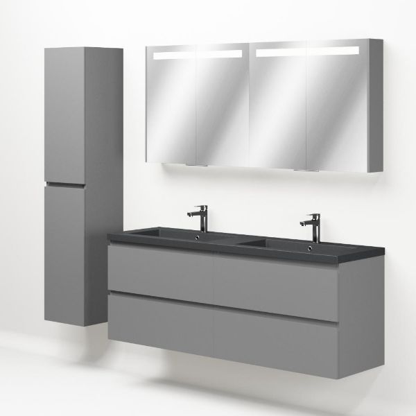 Greeploos badkamermeubel in de kleur licht grijs mat is 160 cm breed.  De wastafel is vervaardig in quartz en heeft de kleur grijs mat. Dit badkamermeubel met deze wastafel is leverbaar tussen de 60 cm t/m 200 cm
