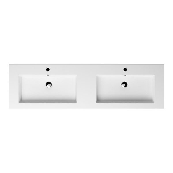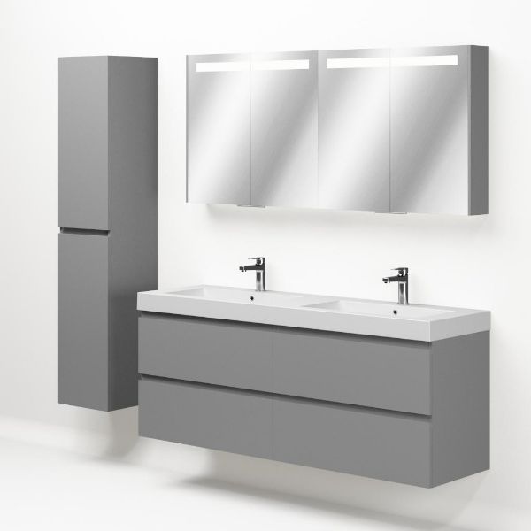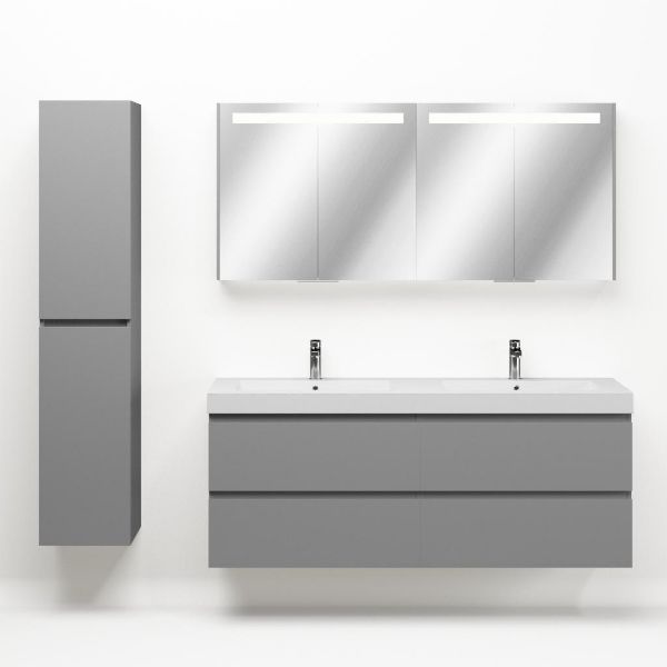 Greeploos badkamermeubel in de kleur licht grijs mat is 160 cm breed. De wastafel is vervaardig in quartz en heeft de kleur wit mat. Dit badkamermeubel met deze wastafel is leverbaar tussen de 60 cm t/m 200 cm