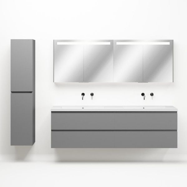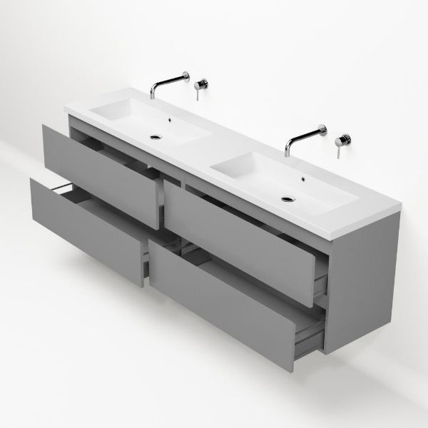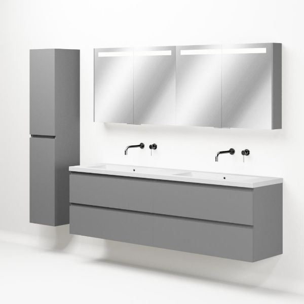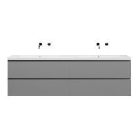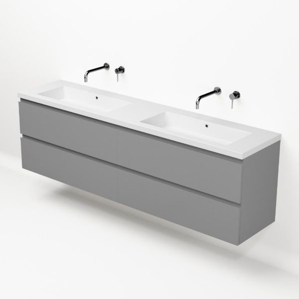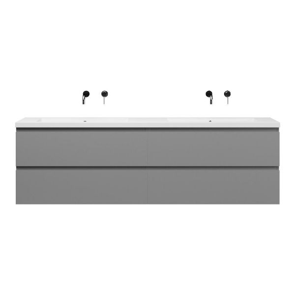 Greeploos badkamermeubel in de kleur licht grijs mat is 200 cm breed. De wastafel is vervaardig in polystone en heeft de kleur wit. Dit badkamermeubel met deze wastafel is leverbaar tussen de 60 cm t/m 200 cm
