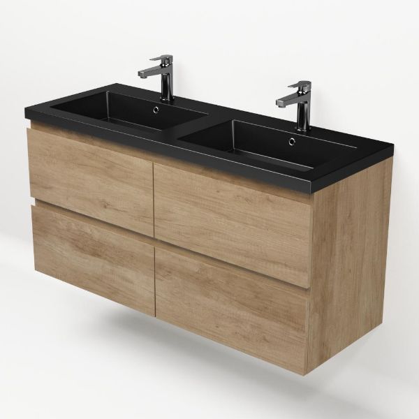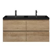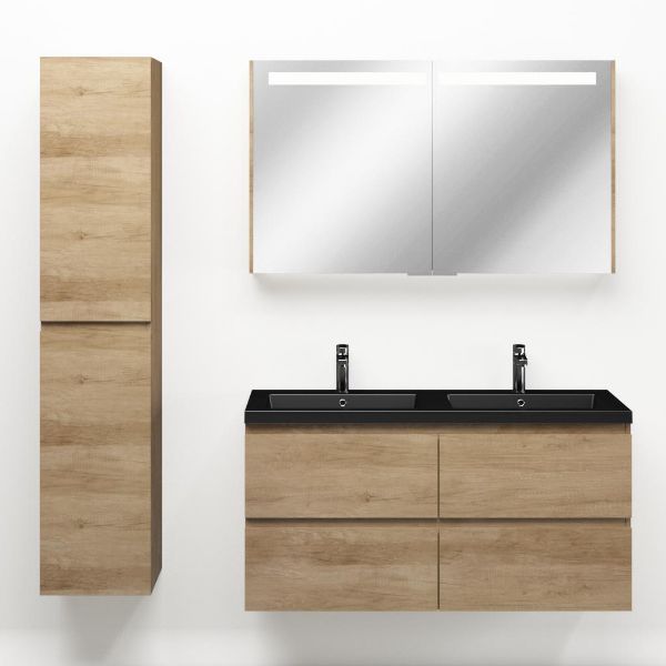 Greeploos badkamermeubel in de kleur olm is 120 cm breed. De wastafel is vervaardig in polystone en heeft de kleur zwart mat. Dit badkamermeubel met deze wastafel is leverbaar tussen de 60 cm t/m 200 cm