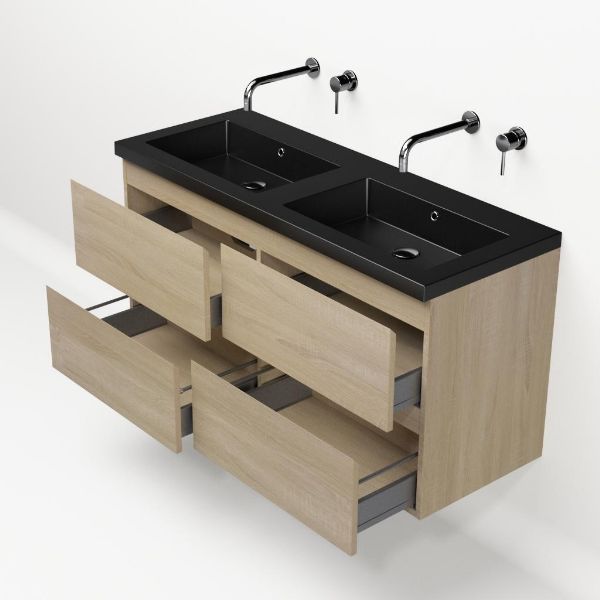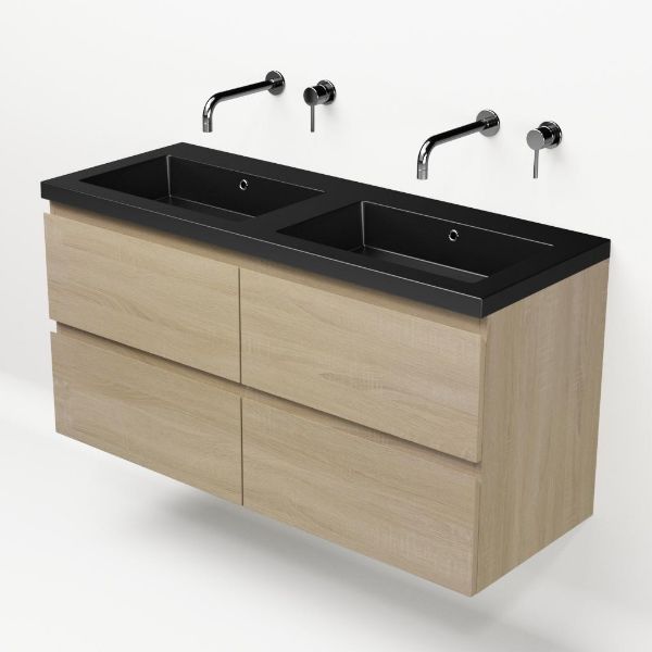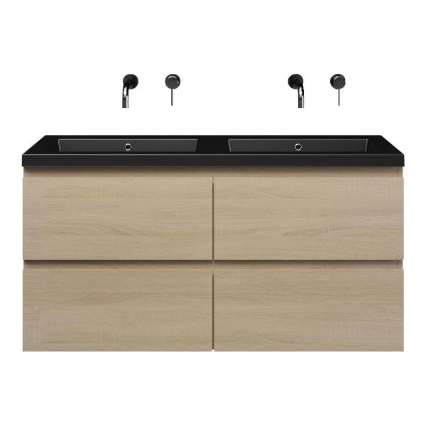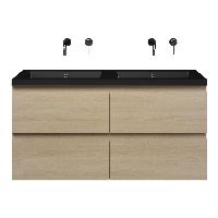 | | Bellanti Elena/Esta badmeubel 120x46 4 softclose laden eiken licht greeploos polystone wastafel dubbel mat zwart zonder kraangaten |