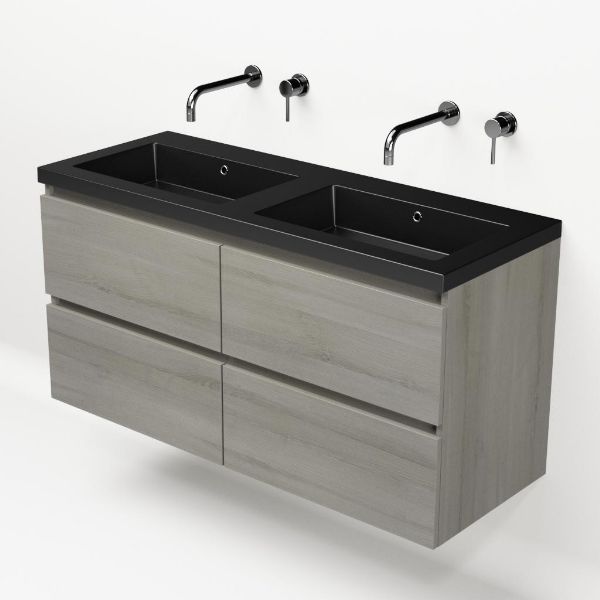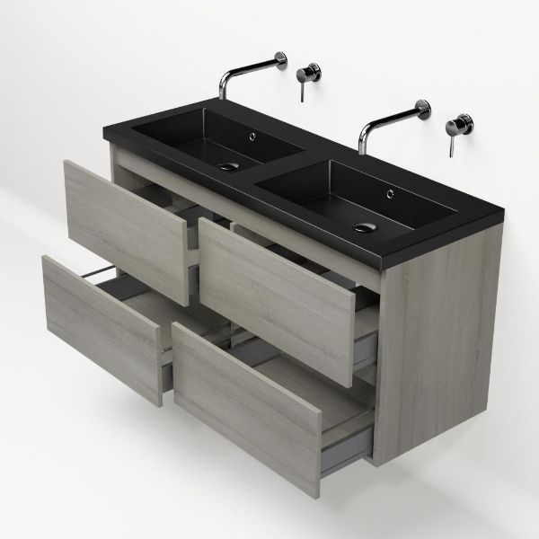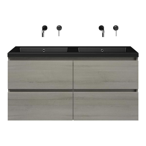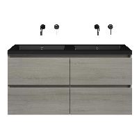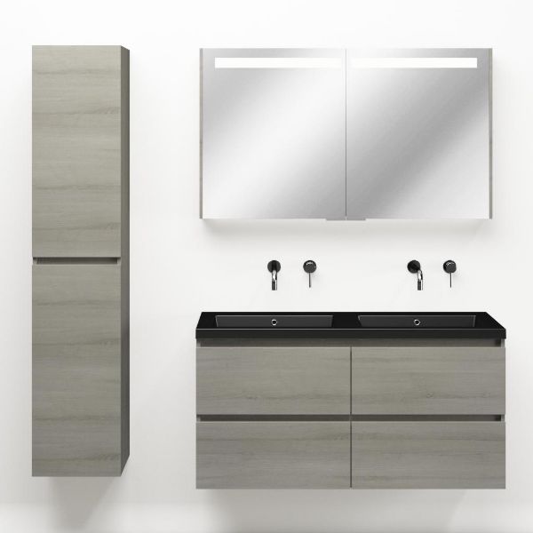 | | Bellanti Elena/Esta badmeubel 120x46 4 softclose laden eiken licht grijs greeploos polystone wastafel dubbel mat zwart zonder kraangaten |