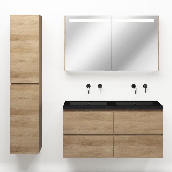 Greeploos badkamermeubel in de kleur olm is 120 cm breed. De wastafel is vervaardig in polystone en heeft de kleur zwart mat. Dit badkamermeubel met deze wastafel is leverbaar tussen de 60 cm t/m 200 cm
