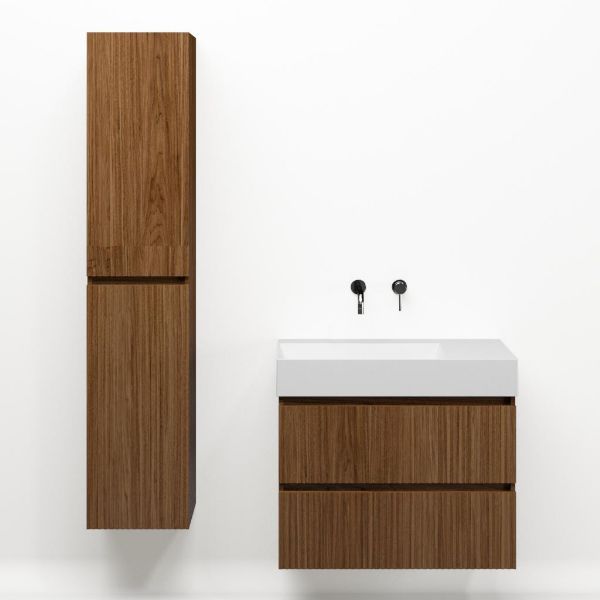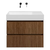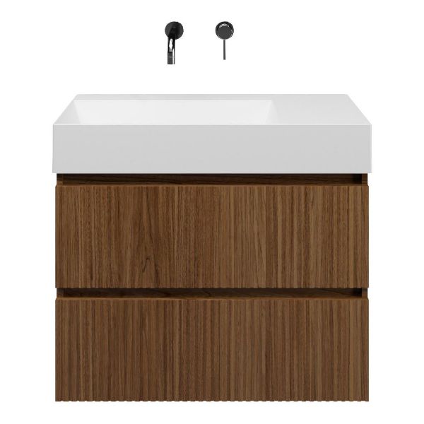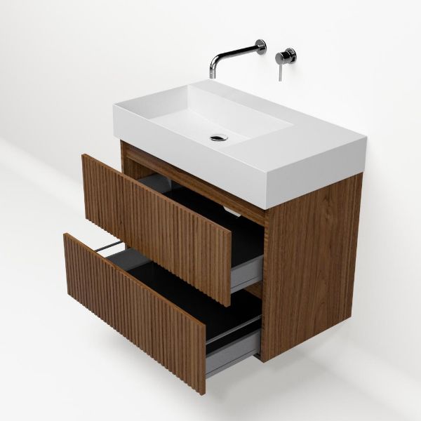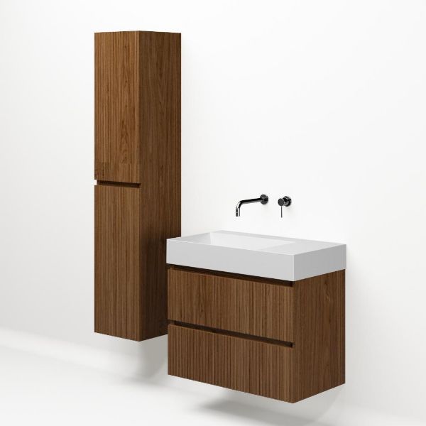 Greeploos badkamermeubel in de kleur warm noten met met ribbel - latjes structuur is 80 cm breed. De wastafel is vervaardig in keramiek en heeft de kleur wit mat keramiek. Dit badkamermeubel met deze wastafel is leverbaar tussen de 60 cm t/m 160 cm