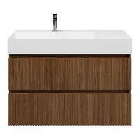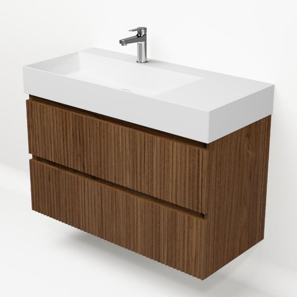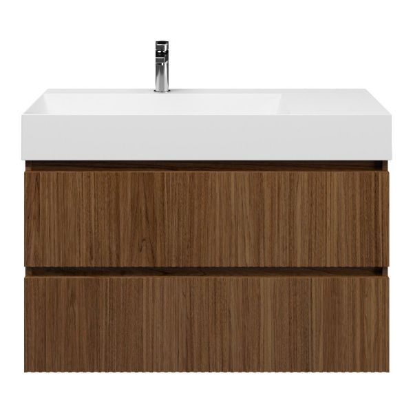 Greeploos badkamermeubel in de kleur warm noten met met ribbel - latjes structuur is 100 cm breed. De wastafel is vervaardig in keramiek en heeft de kleur wit keramiek. Dit badkamermeubel met deze wastafel is leverbaar tussen de 60 cm t/m 160 cm