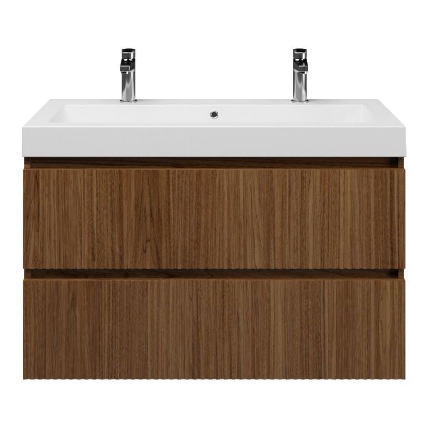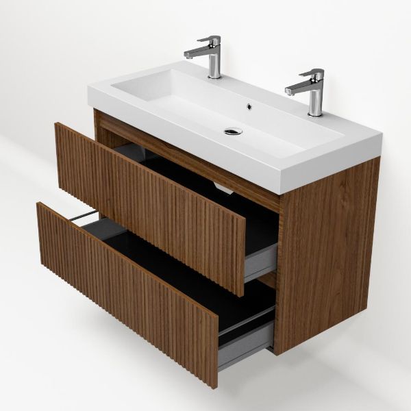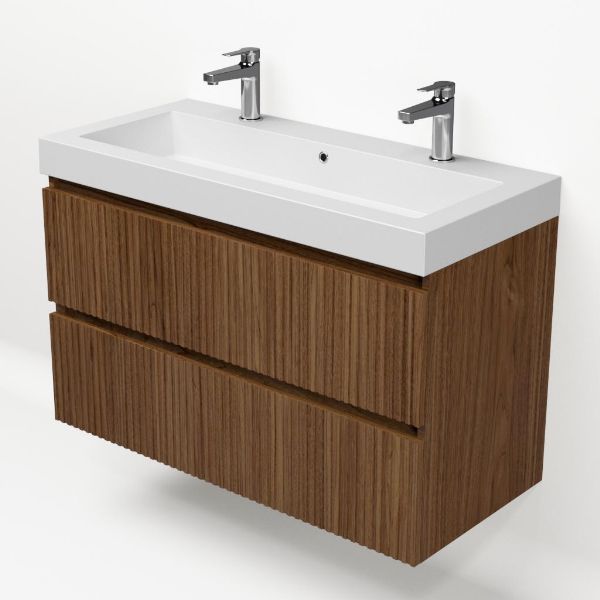 | Bellanti Silvan/Esta-Q badmeubel 100x46 2 softclose laden met ribbel - latjes structuur warm noten greeploos quartz wastafel mat wit met 2 kraangaten |