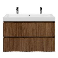| | Bellanti Silvan/Esta-Q badmeubel 100x46 2 softclose laden met ribbel - latjes structuur warm noten greeploos quartz wastafel mat wit met 2 kraangaten |