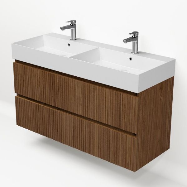 | Bellanti Silvan/Azzurra badmeubel 120x46 2 softclose laden met ribbel - latjes structuur warm noten greeploos keramische wastafel dubbel wit mat met 2 kraangaten |