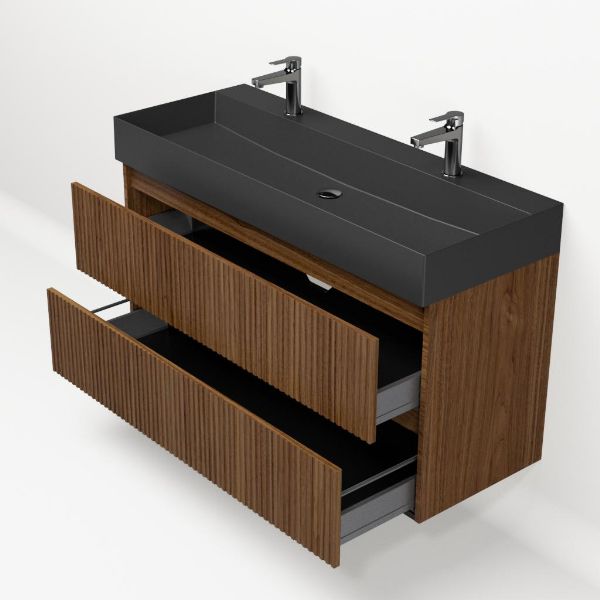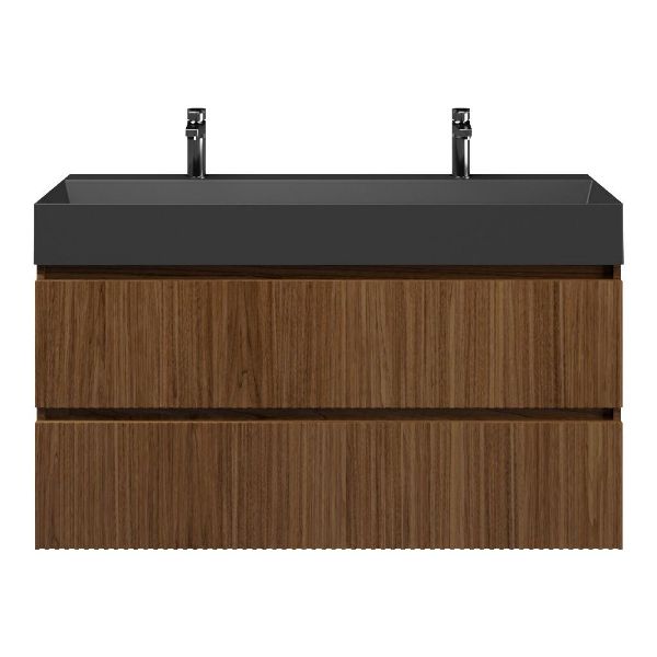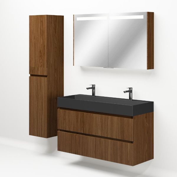 Greeploos badkamermeubel in de kleur warm noten met met ribbel - latjes structuur is 120 cm breed. De wastafel is vervaardig in keramiek en heeft de kleur antraciet mat keramiek. Dit badkamermeubel met deze wastafel is leverbaar tussen de 60 cm t/m 160 cm