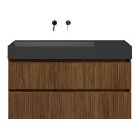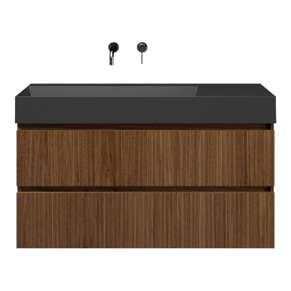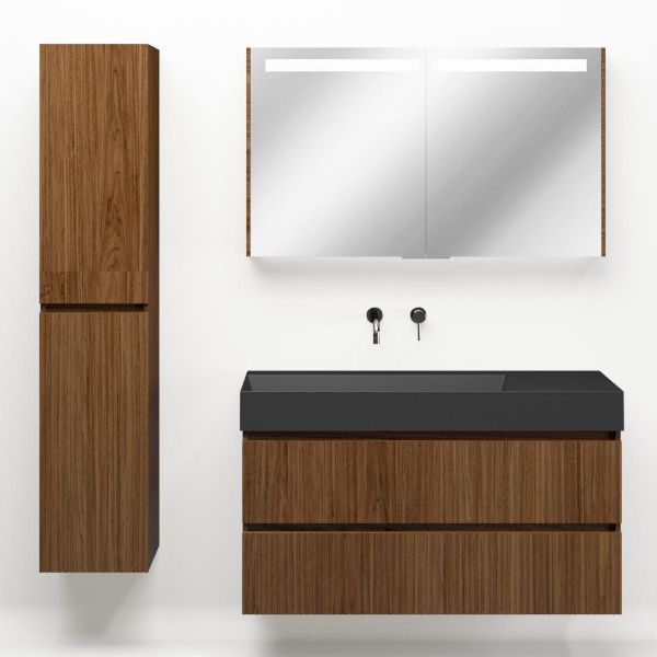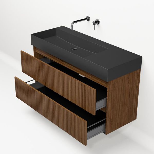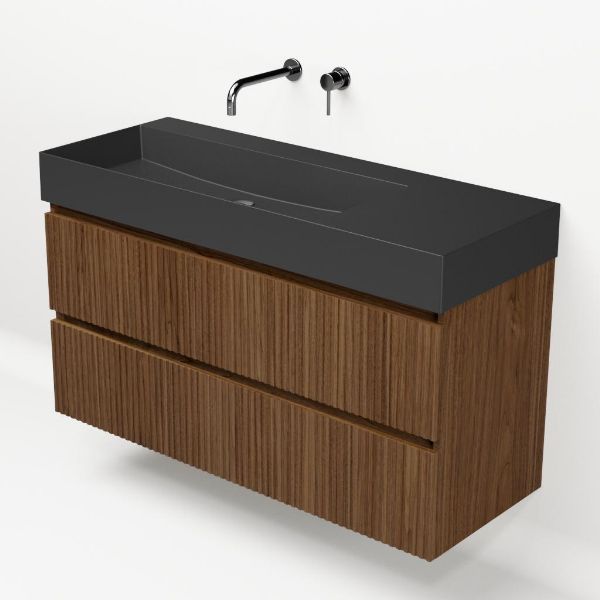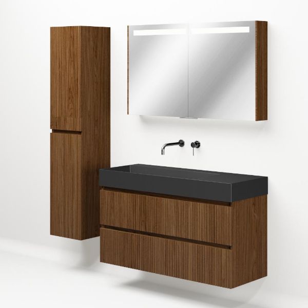 Greeploos badkamermeubel in de kleur warm noten met met ribbel - latjes structuur is 120 cm breed. De wastafel is vervaardig in keramiek en heeft de kleur antraciet mat keramiek. Dit badkamermeubel met deze wastafel is leverbaar tussen de 60 cm t/m 160 cm