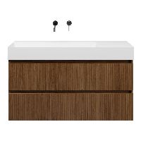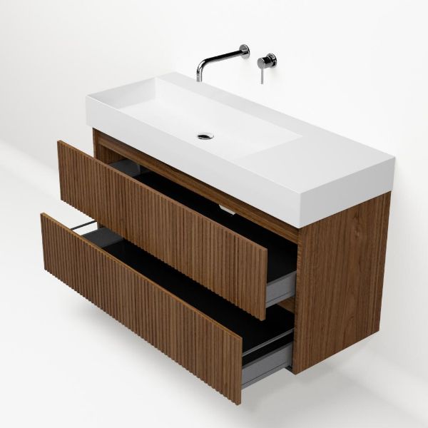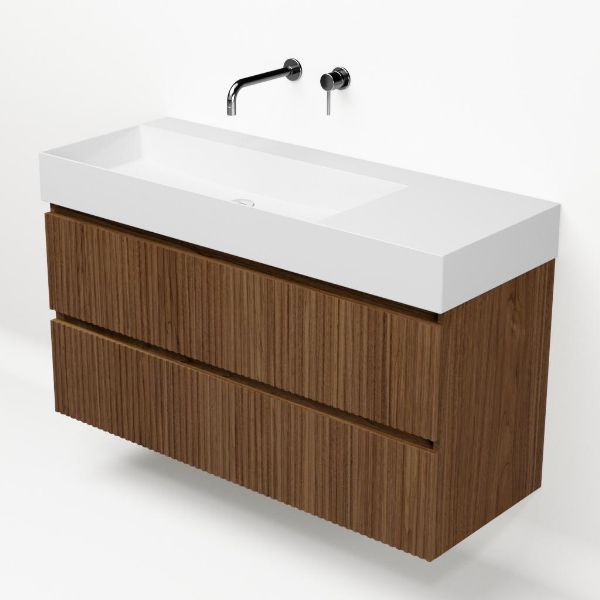 Greeploos badkamermeubel in de kleur warm noten met met ribbel - latjes structuur is 120 cm breed. De wastafel is vervaardig in keramiek en heeft de kleur wit keramiek. Dit badkamermeubel met deze wastafel is leverbaar tussen de 60 cm t/m 160 cm