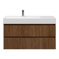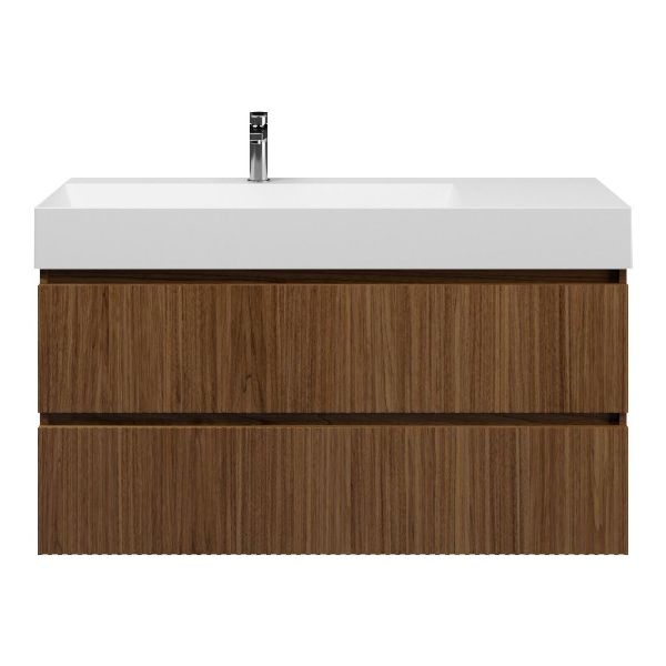 Greeploos badkamermeubel in de kleur warm noten met met ribbel - latjes structuur is 120 cm breed. De wastafel is vervaardig in keramiek en heeft de kleur wit mat keramiek. Dit badkamermeubel met deze wastafel is leverbaar tussen de 60 cm t/m 160 cm