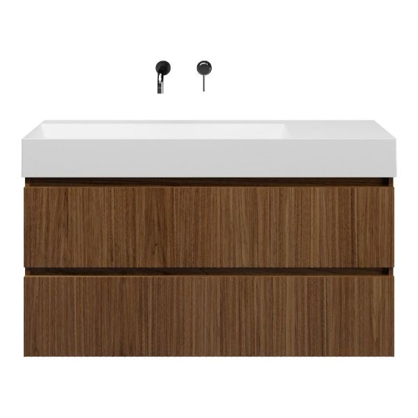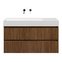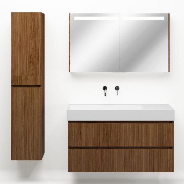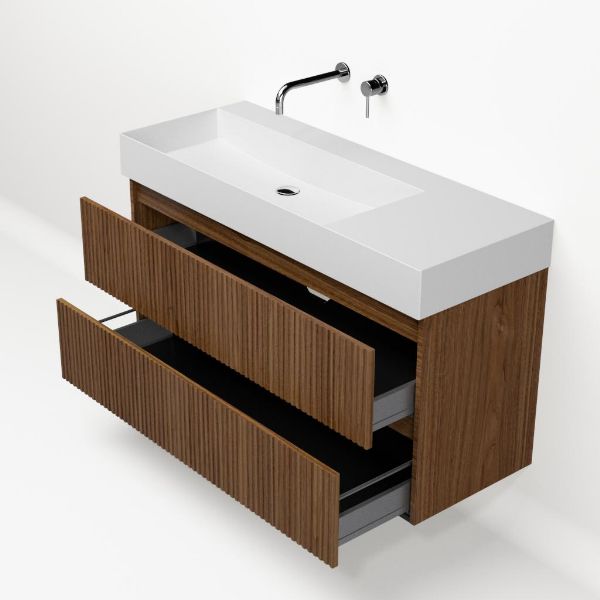 Greeploos badkamermeubel in de kleur warm noten met met ribbel - latjes structuur is 120 cm breed. De wastafel is vervaardig in keramiek en heeft de kleur wit mat keramiek. Dit badkamermeubel met deze wastafel is leverbaar tussen de 60 cm t/m 160 cm