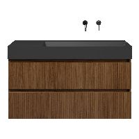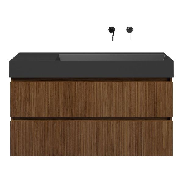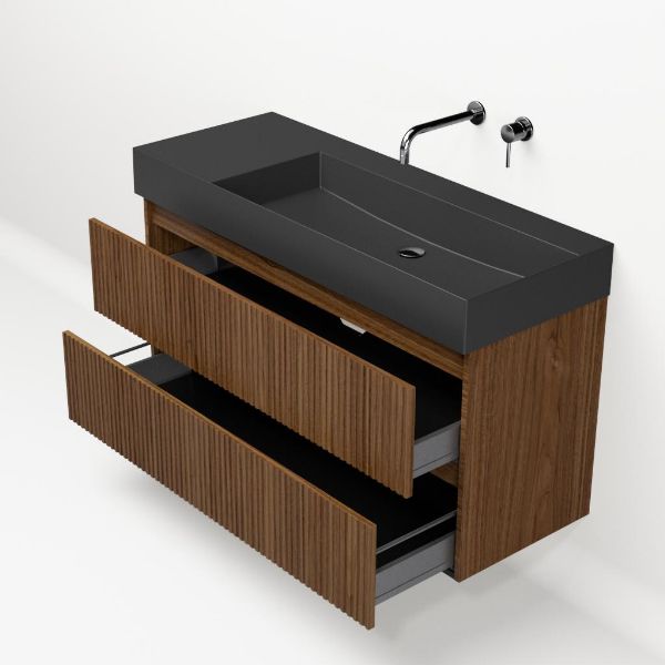 Greeploos badkamermeubel in de kleur warm noten met met ribbel - latjes structuur is 120 cm breed. De wastafel is vervaardig in keramiek en heeft de kleur antraciet mat keramiek. Dit badkamermeubel met deze wastafel is leverbaar tussen de 60 cm t/m 160 cm