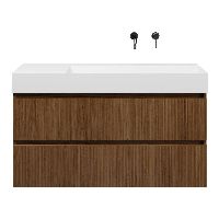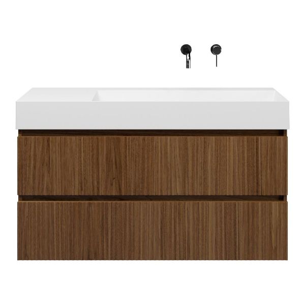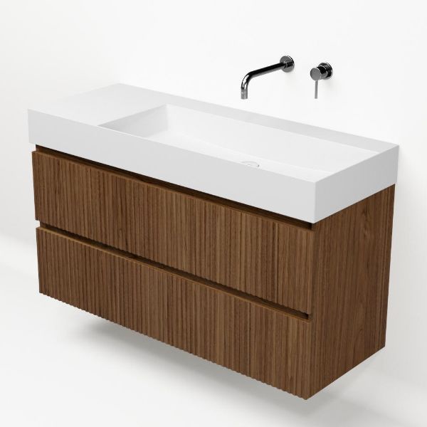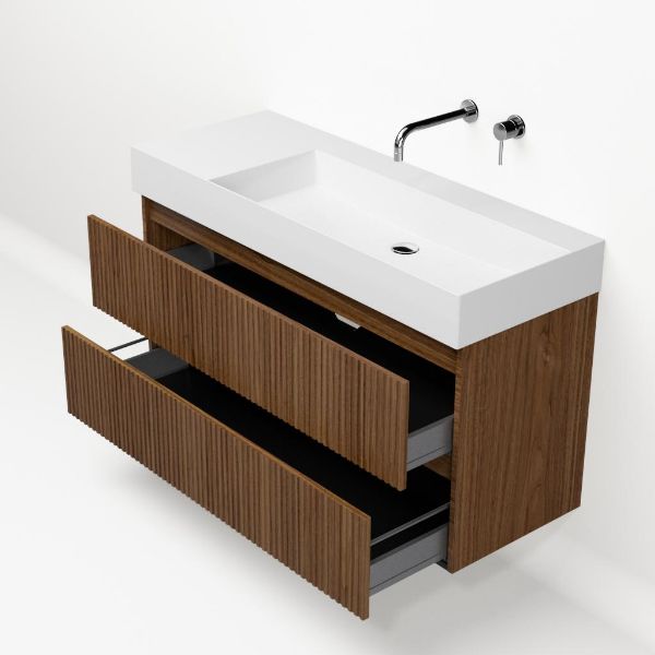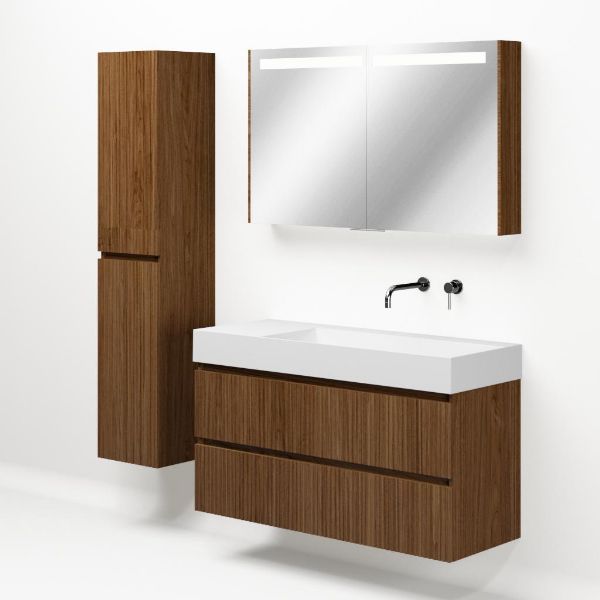 Greeploos badkamermeubel in de kleur warm noten met met ribbel - latjes structuur is 120 cm breed. De wastafel is vervaardig in keramiek en heeft de kleur wit keramiek. Dit badkamermeubel met deze wastafel is leverbaar tussen de 60 cm t/m 160 cm