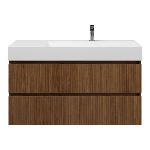 Greeploos badkamermeubel in de kleur warm noten met met ribbel - latjes structuur is 120 cm breed. De wastafel is vervaardig in keramiek en heeft de kleur wit mat keramiek. Dit badkamermeubel met deze wastafel is leverbaar tussen de 60 cm t/m 160 cm