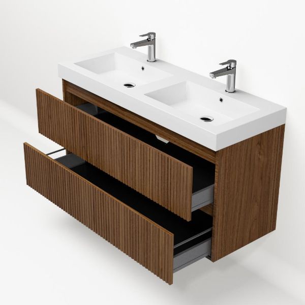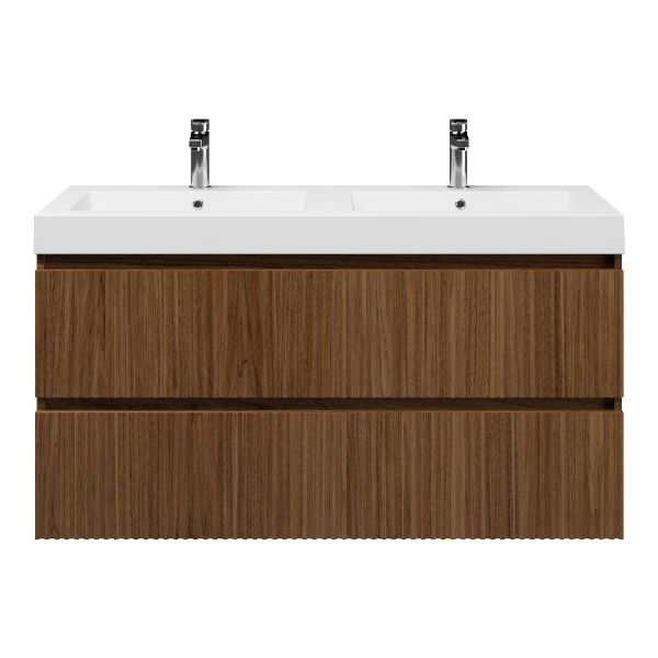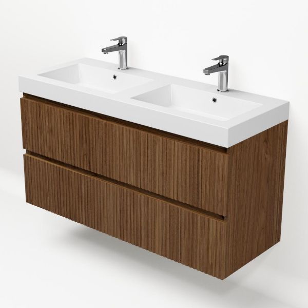 | Bellanti Silvan/Esta badmeubel 120x46 2 softclose laden met ribbel - latjes structuur warm noten greeploos polystone wastafel dubbel wit met 2 kraangaten |