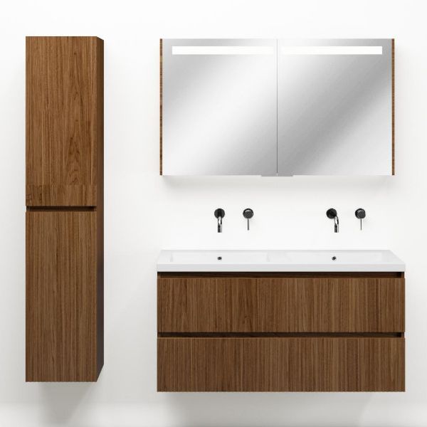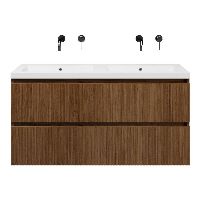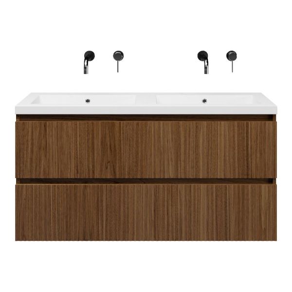 | | Bellanti Silvan/Esta badmeubel 120x46 2 softclose laden met ribbel - latjes structuur warm noten greeploos polystone wastafel dubbel wit zonder kraangaten |