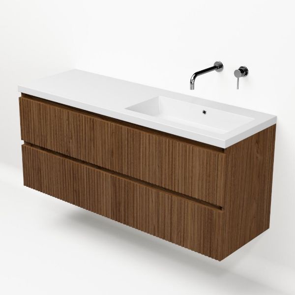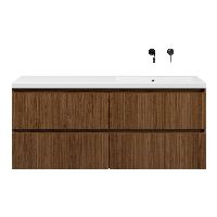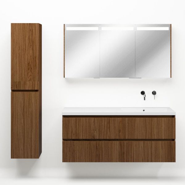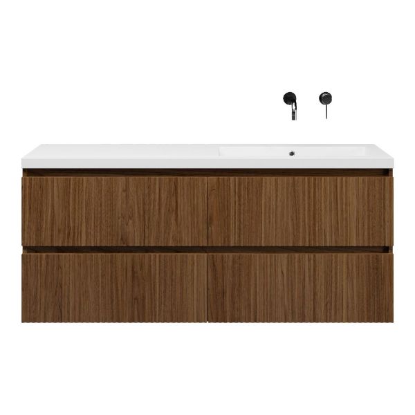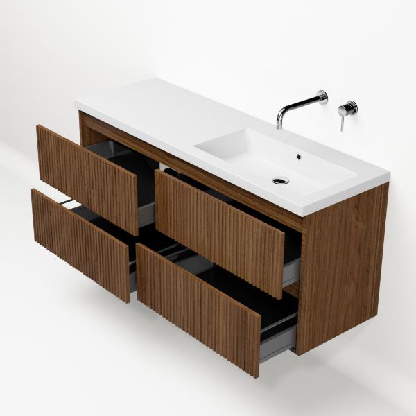 Bellanti Silvan/Esta badmeubel 140x46 4 softclose laden met ribbel - latjes structuur warm noten greeploos polystone wastafel wit zonder kraangaten