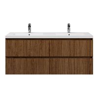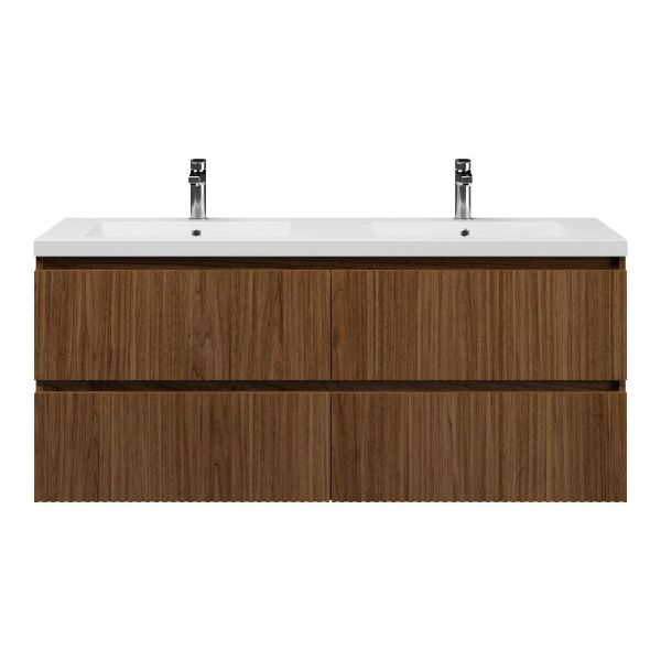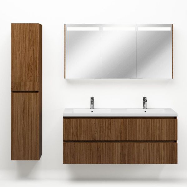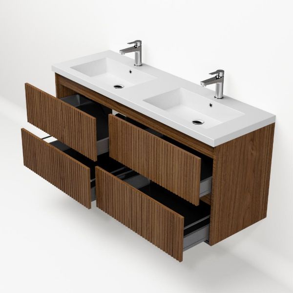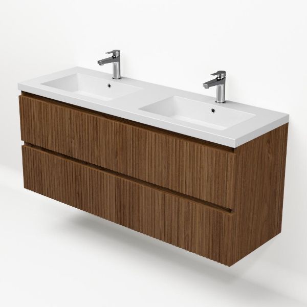 Bellanti Silvan/Esta-Q badmeubel 140x46 4 softclose laden met ribbel - latjes structuur warm noten greeploos polystone wastafel dubbel mat wit met 2 kraangaten