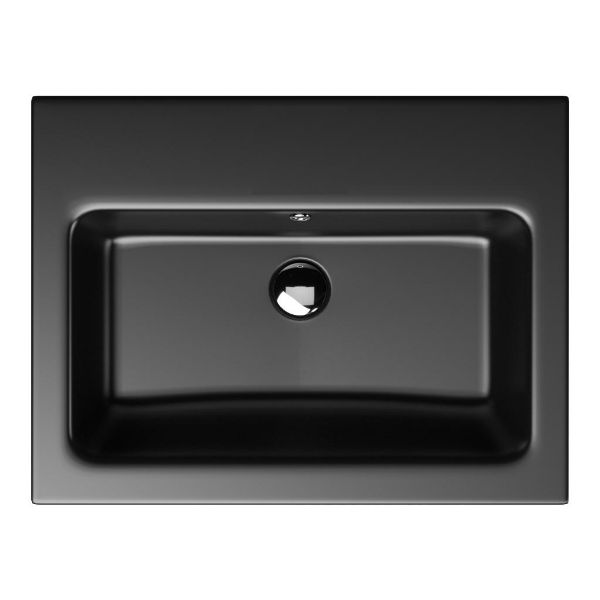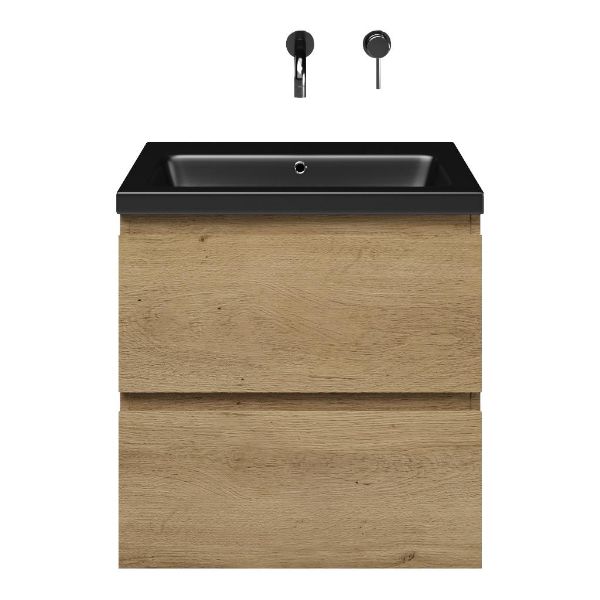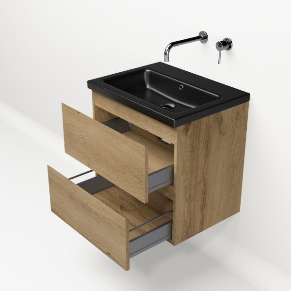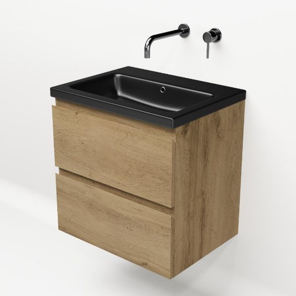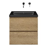 | | Bellanti Gisella/Amelia badmeubel 60x46 2 softclose laden warm eiken greeploos keramische wastafel zwart mat zonder kraangaten |