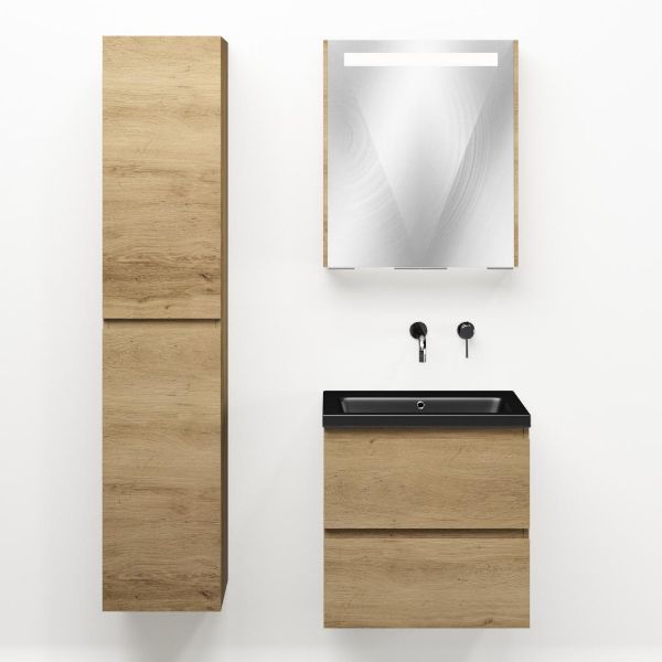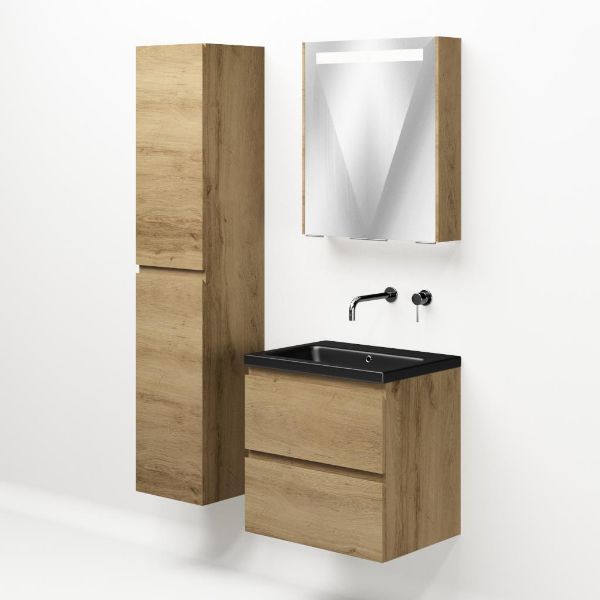 Greeploos badkamermeubel in de kleur eiken warm is 60 cm breed. De wastafel is vervaardig in keramiek en heeft de kleur zwart mat keramiek. Dit badkamermeubel met deze wastafel is leverbaar tussen de 60 cm t/m 120 cm