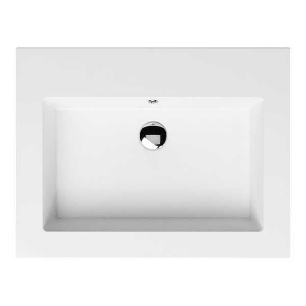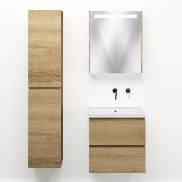 Greeploos badkamermeubel in de kleur eiken warm is 60 cm breed. De wastafel is vervaardig in polystone en heeft de kleur wit. Dit badkamermeubel met deze wastafel is leverbaar tussen de 60 cm t/m 200 cm