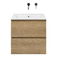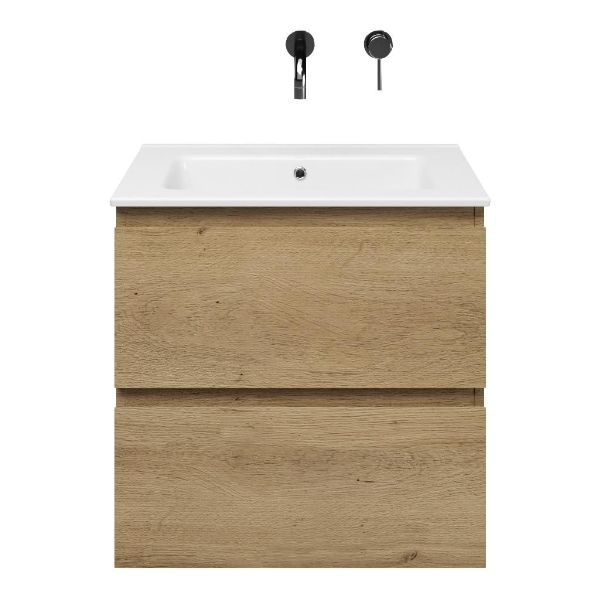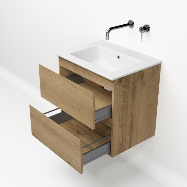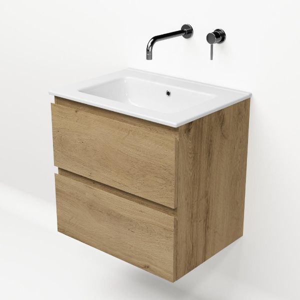 | | Bellanti Gisella/Etna badmeubel 60x46 2 softclose laden warm eiken greeploos keramische wastafel wit zonder kraangaten |