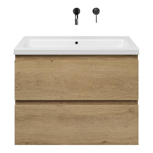 Greeploos badkamermeubel in de kleur eiken warm is 80 cm breed. De wastafel is vervaardig in keramiek en heeft de kleur wit mat keramiek. Dit badkamermeubel met deze wastafel is leverbaar tussen de 60 cm t/m 120 cm