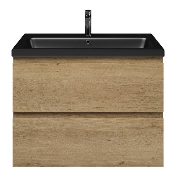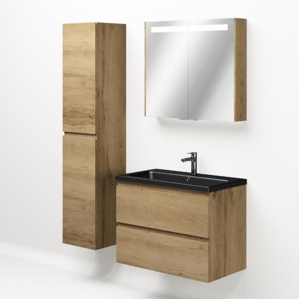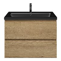 Greeploos badkamermeubel in de kleur eiken warm is 80 cm breed. De wastafel is vervaardig in keramiek en heeft de kleur zwart mat keramiek. Dit badkamermeubel met deze wastafel is leverbaar tussen de 60 cm t/m 120 cm