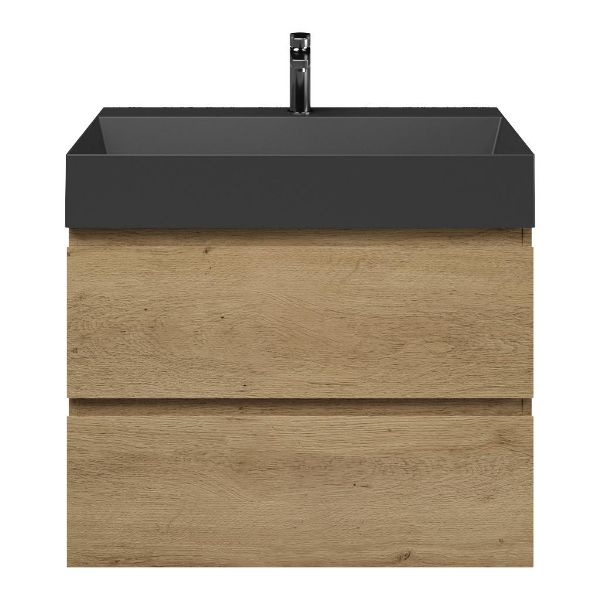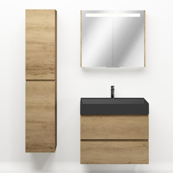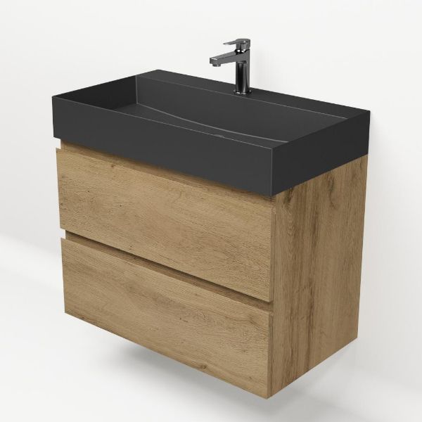 Greeploos badkamermeubel in de kleur eiken warm is 80 cm breed. De wastafel is vervaardig in keramiek en heeft de kleur antraciet mat keramiek. Dit badkamermeubel met deze wastafel is leverbaar tussen de 60 cm t/m 160 cm