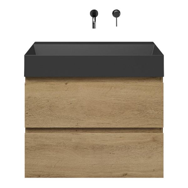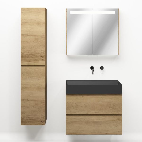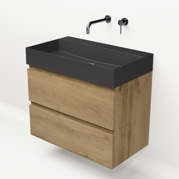 Greeploos badkamermeubel in de kleur eiken warm is 80 cm breed. De wastafel is vervaardig in keramiek en heeft de kleur antraciet mat keramiek. Dit badkamermeubel met deze wastafel is leverbaar tussen de 60 cm t/m 160 cm