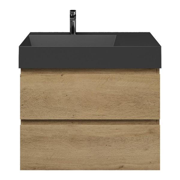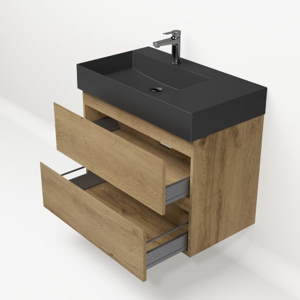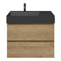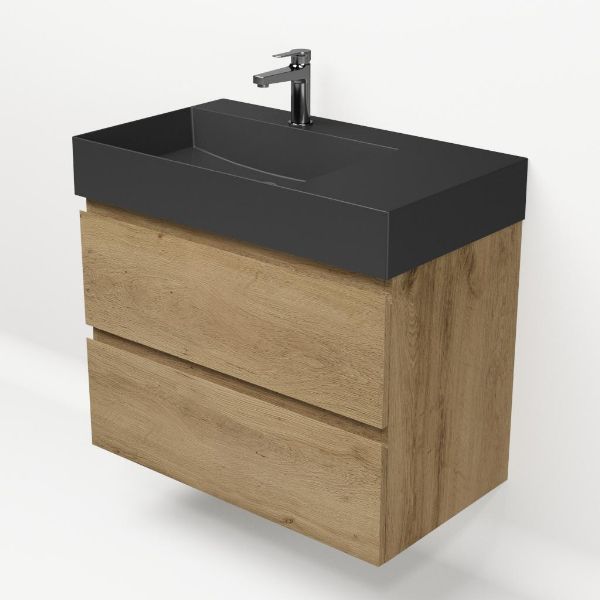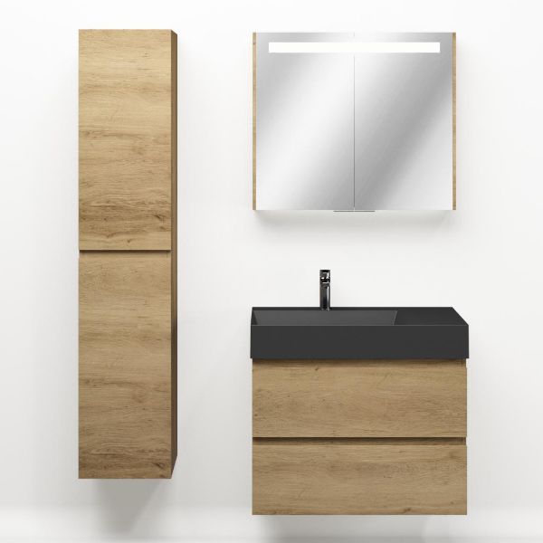 Greeploos badkamermeubel in de kleur eiken warm is 80 cm breed. De wastafel is vervaardig in keramiek en heeft de kleur antraciet mat keramiek. Dit badkamermeubel met deze wastafel is leverbaar tussen de 60 cm t/m 160 cm