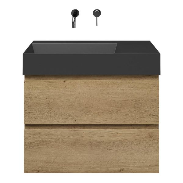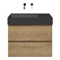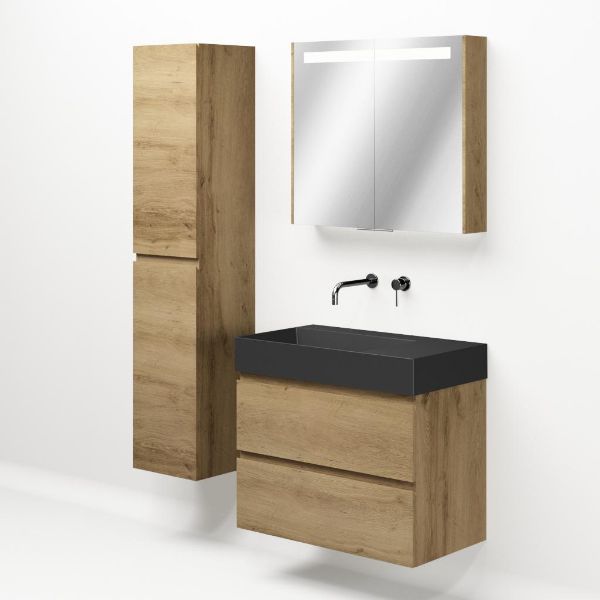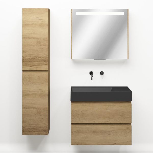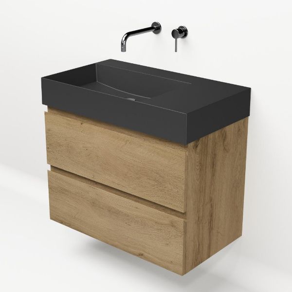 Greeploos badkamermeubel in de kleur eiken warm is 80 cm breed.  De wastafel is vervaardig in keramiek en heeft de kleur zwart mat. Dit badkamermeubel met deze wastafel is leverbaar tussen de 60 cm t/m 160 cm