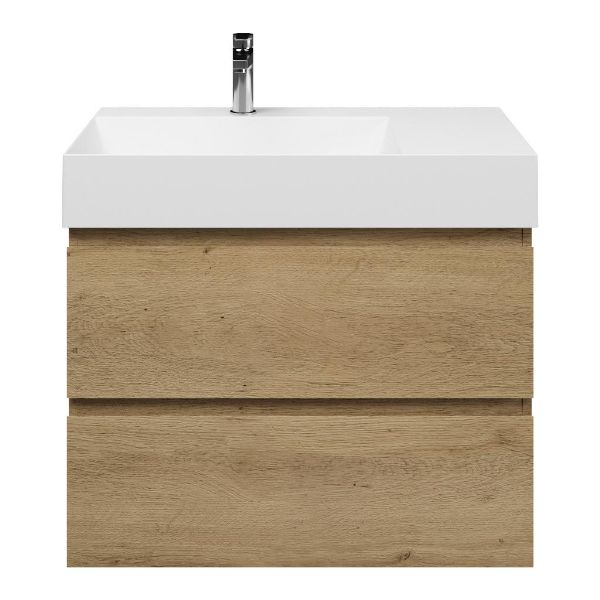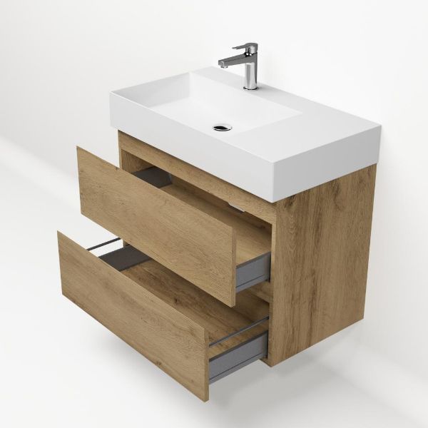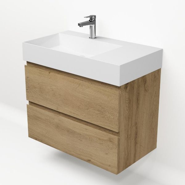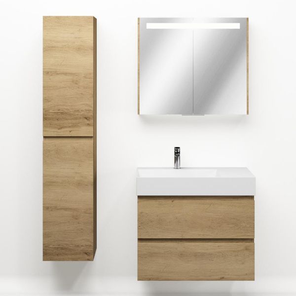 Greeploos badkamermeubel in de kleur eiken warm is 80 cm breed. De wastafel is vervaardig in keramiek en heeft de kleur wit keramiek. Dit badkamermeubel met deze wastafel is leverbaar tussen de 60 cm t/m 160 cm