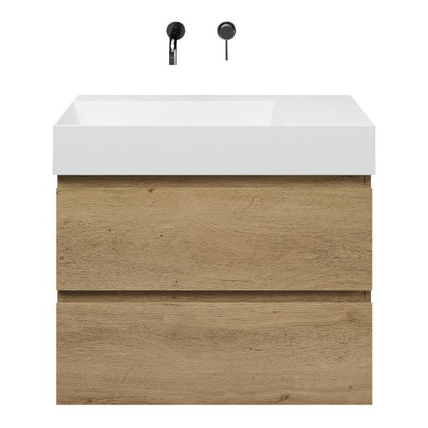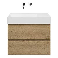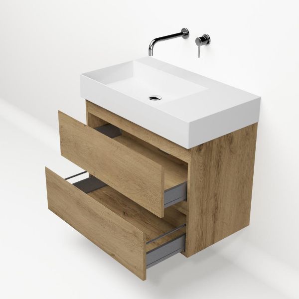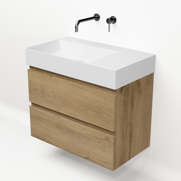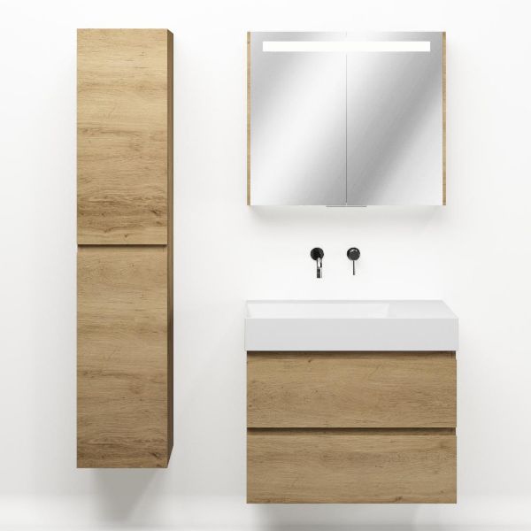 Greeploos badkamermeubel in de kleur eiken warm is 80 cm breed. De wastafel is vervaardig in keramiek en heeft de kleur wit keramiek. Dit badkamermeubel met deze wastafel is leverbaar tussen de 60 cm t/m 160 cm