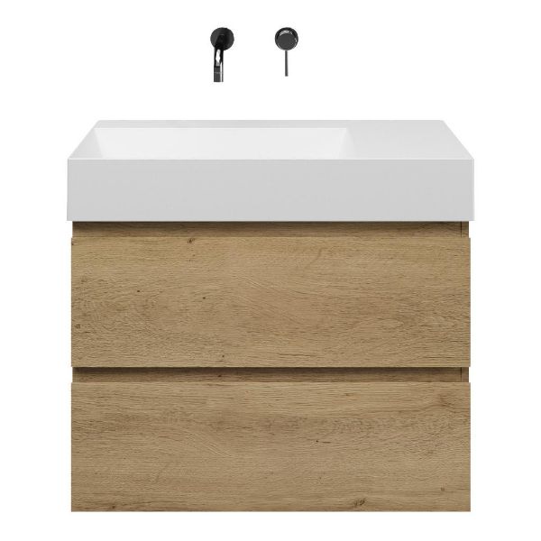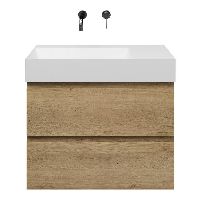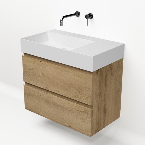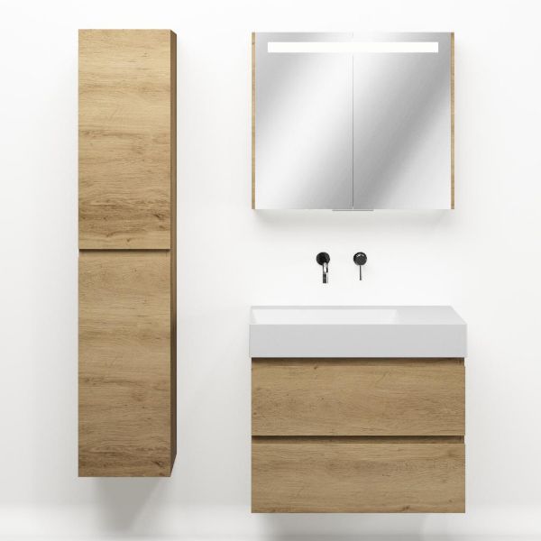 Greeploos badkamermeubel in de kleur eiken warm is 80 cm breed. De wastafel is vervaardig in keramiek en heeft de kleur wit mat keramiek. Dit badkamermeubel met deze wastafel is leverbaar tussen de 60 cm t/m 160 cm