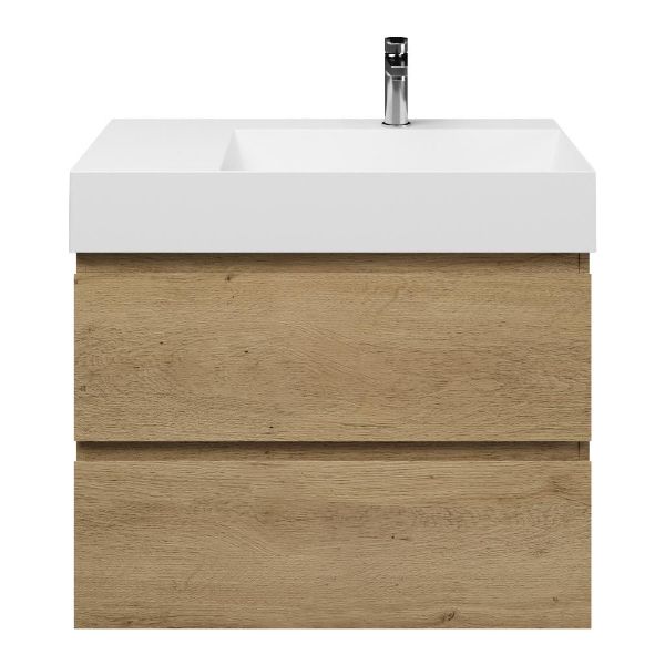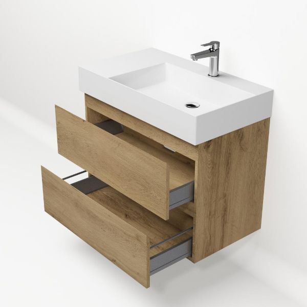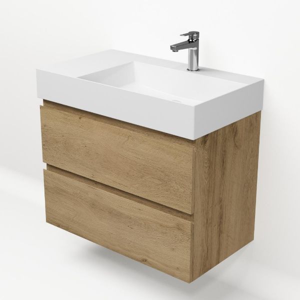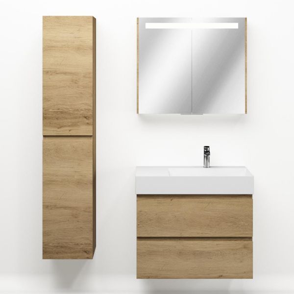 Greeploos badkamermeubel in de kleur eiken warm is 80 cm breed. De wastafel is vervaardig in keramiek en heeft de kleur wit keramiek. Dit badkamermeubel met deze wastafel is leverbaar tussen de 60 cm t/m 160 cm