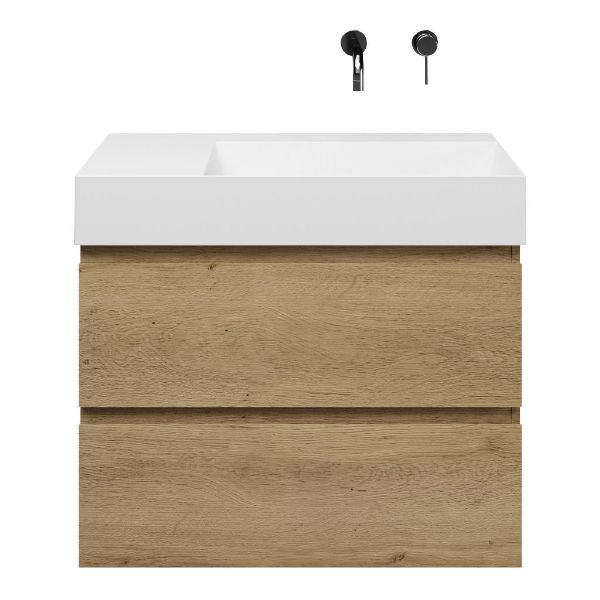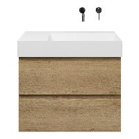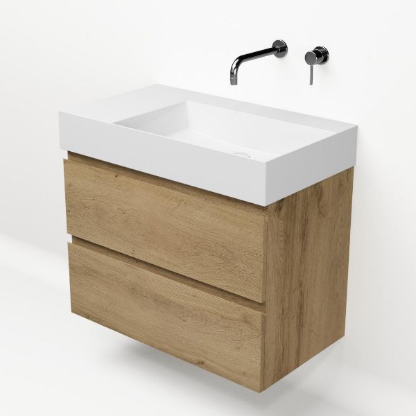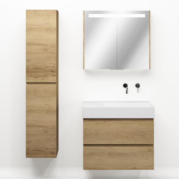 Greeploos badkamermeubel in de kleur eiken warm is 80 cm breed. De wastafel is vervaardig in keramiek en heeft de kleur wit keramiek. Dit badkamermeubel met deze wastafel is leverbaar tussen de 60 cm t/m 160 cm