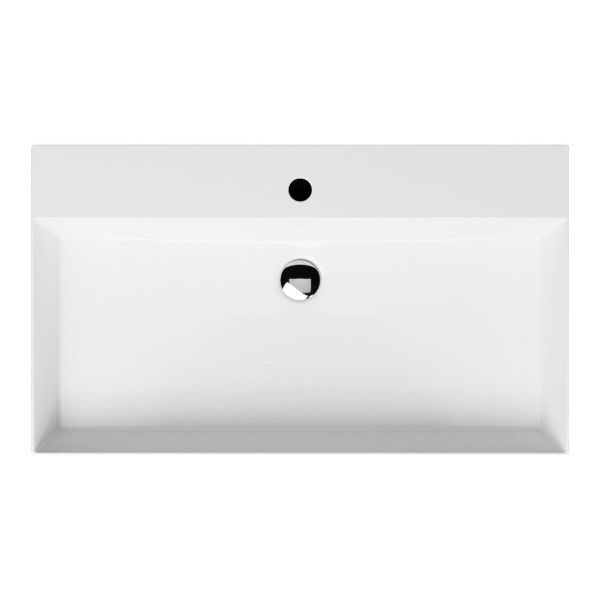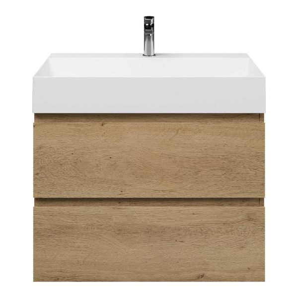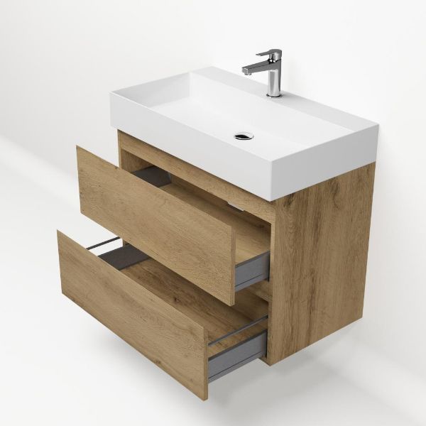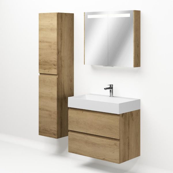 Greeploos badkamermeubel in de kleur eiken warm is 80 cm breed.  De wastafel is vervaardig in keramiek en heeft de kleur wit keramiek. Dit badkamermeubel met deze wastafel is leverbaar tussen de 60 cm t/m 160 cm