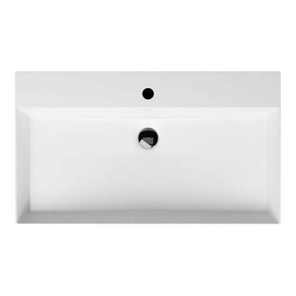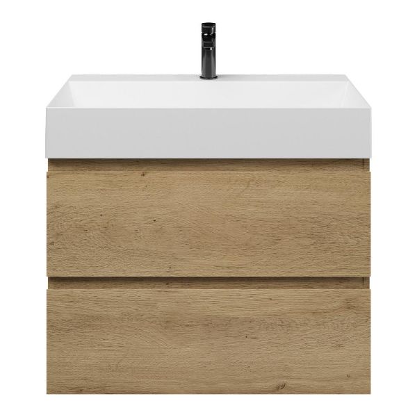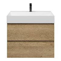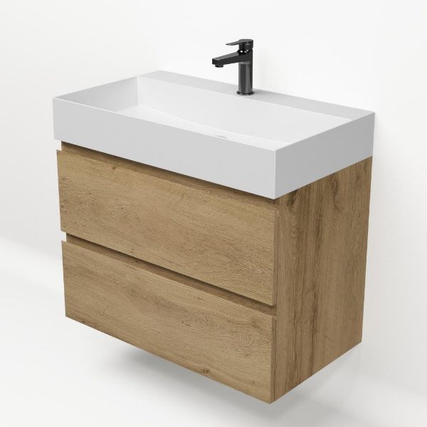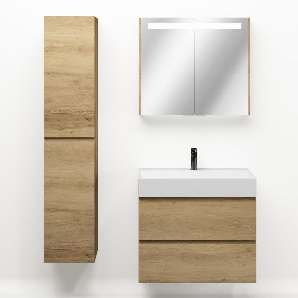 Greeploos badkamermeubel in de kleur eiken warm is 80 cm breed. De wastafel is vervaardig in keramiek en heeft de kleur wit mat keramiek. Dit badkamermeubel met deze wastafel is leverbaar tussen de 60 cm t/m 160 cm