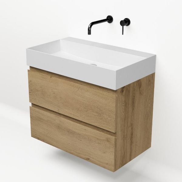| | Bellanti Gisella/Azzurra badmeubel 80x46 2 softclose laden warm eiken greeploos keramische wastafel wit mat zonder kraangaten |