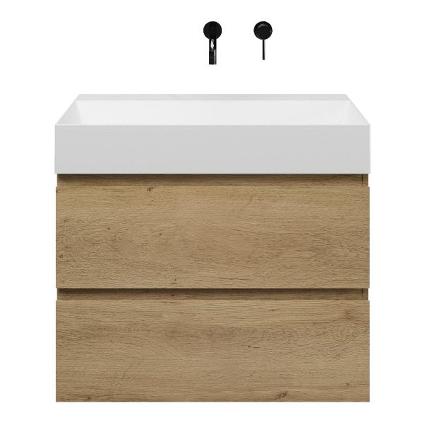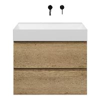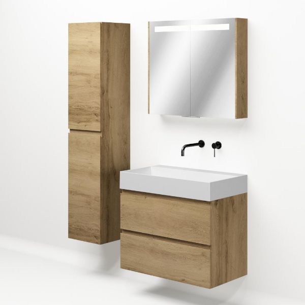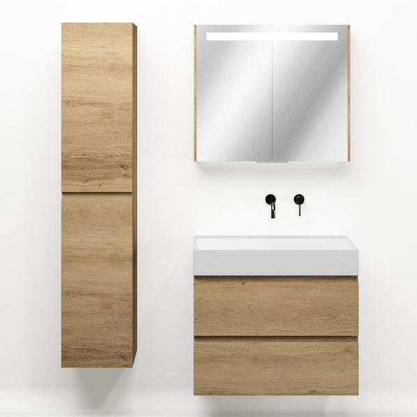 Greeploos badkamermeubel in de kleur eiken warm is 80 cm breed. De wastafel is vervaardig in keramiek en heeft de kleur wit mat keramiek. Dit badkamermeubel met deze wastafel is leverbaar tussen de 60 cm t/m 160 cm